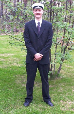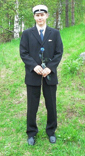 | Tuomas "Tuomaa" Jokisaari on hymyssä suin kolmen vuoden aherruksen jälkeen.. ja mikäs on hymyillessä, kun on valkolakki päässä! Alkukesä Tuomaksella vierähtää paikallisessa S-marketissa kesätöiden merkeissä. Piakkoin edessä ovat myös yliopiston pääsykokeet. Tavoitteena tulevaisuudessa ovat opinnot yliopistossa tekniikan parissa, mutta ennen tulevia opintoja Tuomaa aloittaa heinäkuussa asevelvollisuuden suorittamisen Kainuun Rajavartiostossa. |