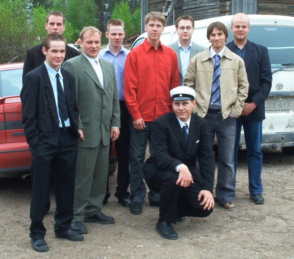 | Kuvassa enemmän ja vähemmän virallinen edustusjoukkueen "kärkiryhmä" Niirasen Jaakon yo -juhlilla. Kuvahan käy melkein joukkuepotretista. Salskeat nuoret miehet vasemmalta alkaen: Pekka Piippo, Jussi Tieva, Hannu Roivainen, Jarkko Puurunen, Paulus Leinonen, Jaakko Niiranen (juhlakalu itse), Mikko Kuusirati, Olli Piippo ja Jukka Holappa. |